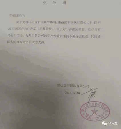 唐山國豐鋼鐵于2018年12月20日發函通知,由于受唐山環保新方案的影響,公司自12月26日起所產熱軋產品(熱軋卷板),停止對下游供應銷售,以保自有冷軋廠為主。